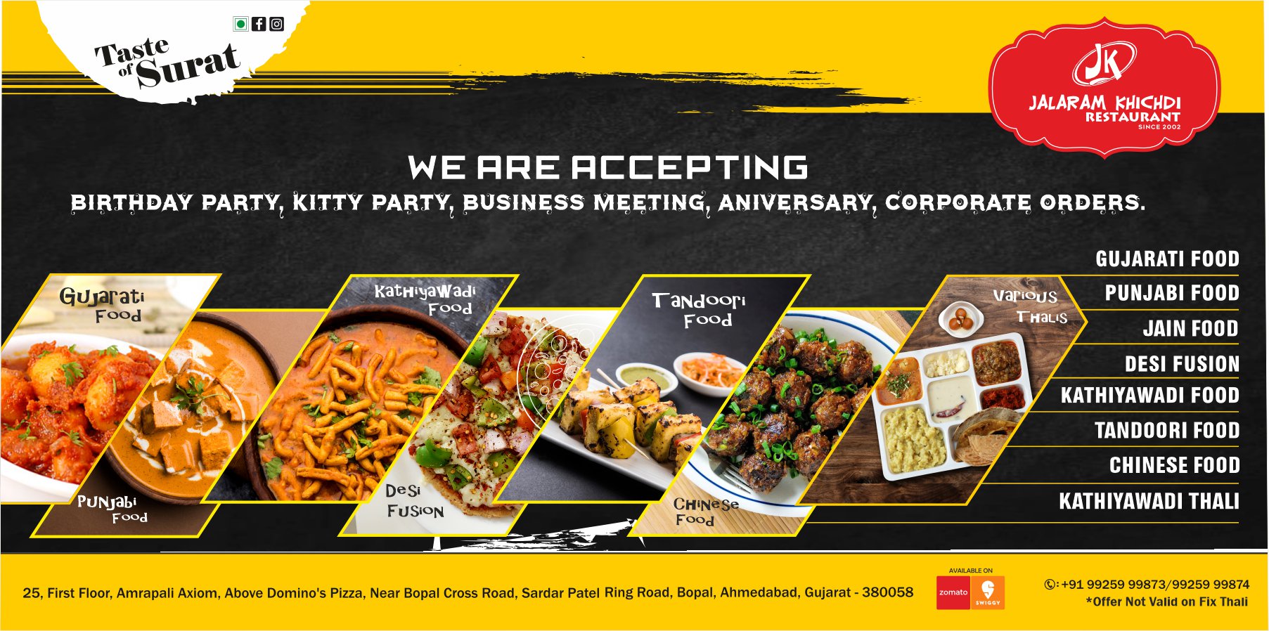 Famous restaurant branches all over Gujarat. Huge varieties of cuisines available.